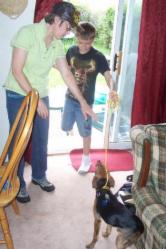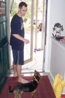 Dad demonstrates calm, assertive leadership Alex blocks Tramp from going out the door walking Tramp using just his energy
