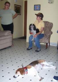 Our beagle, Scout, has never had obedience training. We thought he was a pretty good dog, but there were a few "flaws" that we still wanted to work on. What Jonathan and I thought were big problems with Scout, Julia didn't feel were much of a problem at all. Scout had a habit of wanting to meet people at the door when they came over. He would jump on them. We didn't really know that he just wanted to say "hello" and get some petting. Julia showed us to walk toward him with authority to stop him from jumping. We also let Scout know that he needs to respect our "bubble" -- an area around us where he's not allowed until we invite him in. Scout is learning to respect our space and waits for us to let him in. Amazing!