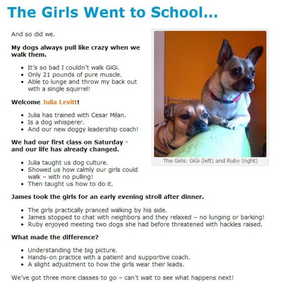 When Julia came to our house, she taught all of us how to walk Peanut. The way we hold the leash, make corrections, and even go in and out the door all send signals to Peanut that we’re the leaders. Now Peanut is starting to understand that she does not have to be in charge and bark at everything. The walks are pleasant and fun, and you can see that my kids are comfortable walking Peanut, too.